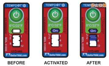 TempDot™Plus標簽應存儲在室溫下,,并必須在反應溫度閾值以上被激活。激活是通過用手指推壓。"On"字出現(xiàn)在第一個窗口中顯示激活。之后5分 鐘內(nèi),在反應溫度或低于反應溫度的情況下將標簽貼到產(chǎn)品上。藍色染料熔化并以控制的速率遷移,,經(jīng)過白色大窗口。這表示暴露在溫度閾值以上的累計時間。當溫 度低于閾值時,,該染料固化并停止移動。如果溫度超過閾值,TempDot®Plus標簽提供即時的視覺跡象。