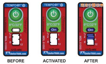 TempDot™Plus標(biāo)簽應(yīng)存儲(chǔ)在室溫下,并必須在反應(yīng)溫度閾值以上被激活。激活是通過(guò)用手指推壓。"On"字出現(xiàn)在第一個(gè)窗口中顯示激活。之后5分 鐘內(nèi),在反應(yīng)溫度或低于反應(yīng)溫度的情況下將標(biāo)簽貼到產(chǎn)品上。藍(lán)色染料熔化并以控制的速率遷移,經(jīng)過(guò)白色大窗口。這表示暴露在溫度閾值以上的累計(jì)時(shí)間。當(dāng)溫 度低于閾值時(shí),該染料固化并停止移動(dòng)。如果溫度超過(guò)閾值,TempDot®Plus標(biāo)簽提供即時(shí)的視覺(jué)跡象。